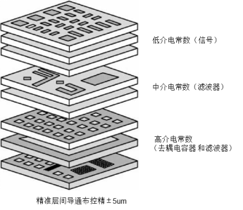 LTCC工藝在生瓷帶上利用激光打孔、微孔注漿、精密導體漿料印刷等工藝制出所需要的電路圖形,并將多個被動組件(如低容值電容、電阻、濾波器、阻抗轉換器、耦合器等)埋入多層陶瓷基板中,然后疊壓在一起,內(nèi)外電極可分別使用銀、銅、金等金屬,在900℃下燒結,制成三維空間互不干擾的高密度電路,也可制成內(nèi)置無源元件的三維電路基板,在其表面可以貼裝IC和有源器件,制成無源/有源集成的功能模塊,可進一步將電路小型化與高密度化,特別適合用于高頻通訊用組件。