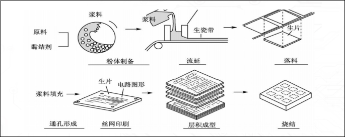 低溫共燒多層陶瓷(LTCC)是以陶瓷作為電路基板材料,利用無機陶瓷粉加上有機黏結劑混合成泥狀的漿料,經(jīng)過刮刀成型干燥后制成一張張的薄生胚,再利用網(wǎng)版印刷技術將電路印在上面,于各層打出上萬個通孔,內(nèi)外電極可分別使用銀、金等金屬,在攝氏850-900多度的燒結爐中,以平行式印刷涂布制程燒結形成整合式陶瓷組件。